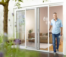 Die stabile und doch unauffällige Lösung für grosse Öffnungen an Terrassen oder Wintergärten. Die bis zu 6 Flügel werden seitlich verschoben.